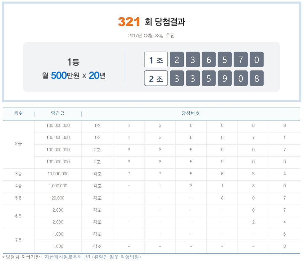 [아시아경제 임혜선 기자]23일 추첨한 제321회차 '연금복권520'의 1등 당첨번호가 '1조236570'와'2조335908'번으로 결정됐다.연금복권 1등 당첨금은 매월 500만원씩 20년간 연금 형식으로 지급된다. 세금을 뺀 실 수령액은 약 월 390만원이다. 2등 당첨번호는 각 1등 맨 끝자리에 1을 더하고 뺀 '1조236569'번·'1조236571'번·'2조335907'번·'2조335909'번이다. 당첨금은 1억원이다.3등 당첨번호는 각조 '775654'번으로 당첨금 1000만원이 주어진다. 100만원이 주어지는 4등 당첨번호는 각조 끝자리 '13180'번이다.5등 당첨번호는 각조 끝자리 '807'번으로 당첨금 2만원, 6등 당첨번호는 각조 끝자리 '24'번과 '07'번으로 당첨금 2000원을 받는다. 당첨금 1000원을 받는 7등 당첨번호는 각조 끝자리 '6'번과 '8'번이다.임혜선 기자 lhsro@asiae.co.kr<ⓒ세계를 보는 창 경제를 보는 눈, 아시아경제(www.asiae.co.kr) 무단전재 배포금지>
