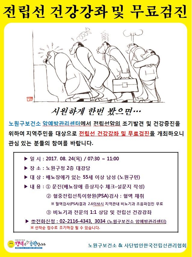 [아시아경제 박종일 기자] 노원구(구청장 김성환)가 24일 오전 7시30분부터 오전 11시까지 노원구청 대강당에서 '암예방실천학교! 전립선암 조기발견!'을 운영한다. 사단법인 한국전립선관리협회가 함께하는 이번 무료검진은 전립선암을 조기 발견해 치료와 연계, 전립선 건강강좌를 통해 자기 관리 능력을 향상시키기 위함이다. 대상은 55세 이상 지역주민인 남성이다. 지난 11일부터 사전접수를 진행해 약 250명이 사전 신청을 했다. 많은 사전신청자가 우선으로 검진을 받게 되므로 당일 접수는 하지 않는다.검진대상자는 처음에 배뇨장애 증상지수를 체크하며 설문지를 작성한다. 이후 혈중전립선특이항원(PSA)검사를 위해 혈액을 채취한다.