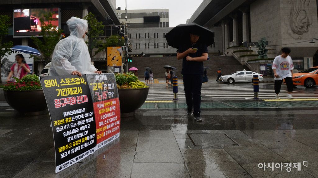 지난 21일 서울 종로구 광화문광장에서 한 시민이 기간제교사와 스포츠강사, 영어회화 전문강사 등의 정규직화 반대를 촉구하는 1인 시위를 하고 있다. (사진: 문호남 기자 munonam@)