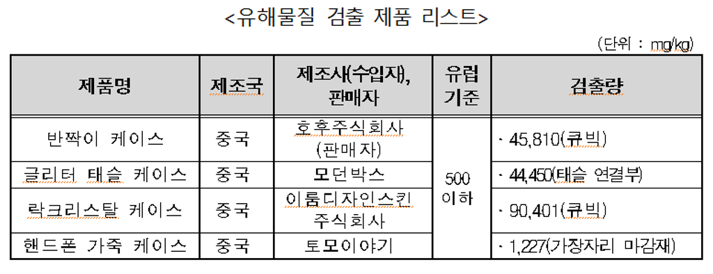 소비자원 30개 제품 조사, 6개 제품 중금속 검출5개 제품, 女兒 좋아하는 '큐픽'…가죽제품서도 납 나와[아시아경제 지연진 기자]스마트폰 케이스에서도 인체에 치명적인 납과 카드뮴 등이 다량 검출됐다. '살충제 계란'과 '화학 생리대'에 이어 현대인이 항상 소지한 휴대전화 관련 용품에서도 유해물질이 나오면서 일상용품에 대한 공포가 확산되고 있다. 한국소비자원은 시중에 유통·판매 중인 휴대폰 케이스 30개 제품(합성수지 재질 20개·가죽 재질 10개)을 대상으로 유해물질 안전성 및 표시실태를 조사한 결과 6개 제품에서 카드뮴과 납이 검출됐다. 이들 모두 제조국이 중국이었다. 3개 제품의 경우 유럽연합 기준(100㎎/㎏이하)을 최대 9219배 초과하는 ‘카드뮴’이, 4개 제품에서 유럽연합 기준(500㎎/㎏이하)을 최대 180.1배나 넘는 납이 나왔다. 또 1개 제품은 기준(어린이제품, 0.1%이하)을 1.8배 초과하는 ‘프탈레이트계 가소제(DBP)’가 검출됐다. 어린이가 사용하는 제품의 경우 '어린이 제품안전 특별법'에 따라 카드뮴은 75㎎/㎏ 이하, 납 300㎎/㎏ 이하, 프탈레이트계 가소제 0.1% 이하로 함량을 제한하고 있다. 납은 노출될 경우 식욕 부진과 빈혈, 소변양 감소, 팔·다리 근육 약화 등을 유발할 수 있고, 카드뮴의 경우 폐와 신장에 유해한 영향을 미쳐 발암등급 1군으로 분류된다. 프탈레이트계 가소제는 내분비계 장애 추정 물질로 정자수 감소와 유산 등 생식 독성이 있다. 유해물질이 검출된 5개 휴대폰 케이스의 경우 부착된 큐빅과 금속 등 장식품에서 납과 카드뮴, 프탈레이트계 가소제가 검출됐다. 가죽소재 1개 제품에선 납이 확인됐다. 최근 수년간 스마트폰 사용시간이 길어지면서 휴대폰 케이스는 피부와 장시간 접촉한다. 더욱이 만 13세 이하의 어린이도 스마트폰을 직접 사용하거나 부모의 스마트폰을 사용하는 만큼 휴대폰 케이스의 유해물질 관리는 필수적이다. 하지만 현재 휴대폰 케이스에 대한 관리는 미흡한 실정이다. '유독물질 및 제한물질·금지물질의 지정' 고시에 따라 금납과 카드뮴 사용을 제한하고 있지만, 이는 금속 장신구 등에 한정됐다. 신용카드 수납 등 지갑 겸용의 성인용 가죽 휴대폰 케이스는 '전기용품 및 생활용품 안전관리법'에 따른 ‘공급자적합성 생활용품(가죽제품)’으로 관리되지만 납과 카드뮴 등의 중금속에 대한 기준은 없다. 또 사후 피해구제 등을 위한 사업자정보(제조자명, 전화번호)나 재질 등 제품 선택 정보(제조국, 제조연월일, 재질) 표시 여부를 조사한 결과, 관련 정보를 모두 표시한 제품은 없었다. 17개 제품(56.7%)은 표시가 전혀 없었고, 13개(43.4%) 제품은 일부 항목만 표시하고 있었다. 한국소비자원은 소비자 안전 확보를 위해 관련 업체에 유해물질 과다 검출 제품 및 표시 미흡 제품에 대한 시정조치를 권고하는 한편, 해당 업체들은 이를 수용하여 회수 등의 조치 및 표시를 개선하기로 하였다.지연진 기자 gyj@asiae.co.kr<ⓒ세계를 보는 창 경제를 보는 눈, 아시아경제(www.asiae.co.kr) 무단전재 배포금지>