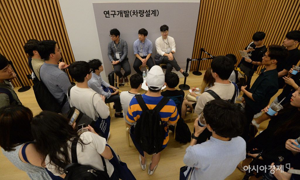 [아시아경제 문호남 기자] 24일 경기도 고양시 '현대 모터스튜디오 고양'에서 열린 현대자동차 채용박람회를 찾은 구직자들이 현직 선배들과 취업 상담을 하고 있다. 문호남 기자 munonam@asiae.co.kr<ⓒ세계를 보는 창 경제를 보는 눈, 아시아경제(www.asiae.co.kr) 무단전재 배포금지>