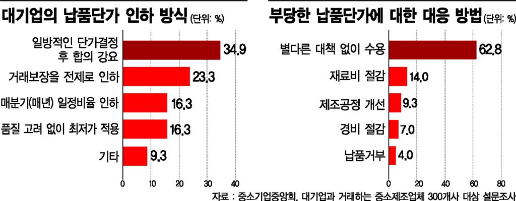 납품단가는 거래 당사자 간 '사적 계약'이며 시장 논리에 따라 결정된다. 대기업에게도 그럴만한 사정이 생기면 중소기업 입장에선 다른 거래처를 찾거나 원가를 절감해 대응하는 게 맞다. 그런데 현실에선 어떨까. 같은 조사에서 '거래처가 납품단가를 결정한 이유가 무엇인가'라는 질문에 중소기업의 58.1%는 '거래처(대기업)의 가격경쟁에 따른 원가인하 전가'를 꼽았다. 다음으로는 '경기불황'(14.0%), '업계관행'(11.6%), '생산성 향상을 이유로 원가인하'(9.3%) 등 순이었다. 대기업에게 비용절감 요인이 생기면 납품단가에도 영향을 줄 수밖에 없는데, 이를 중소기업에 '전가'하는 게 문제다. 특히 중소기업이 '생산성을 개선했다'는 이유로 납품단가를 내리는 것은 중소기업의 혁신 성과를 대기업이 가로채는 것이라 죄질이 더 나쁘다.대기업이 자체 부담까지 중소기업에 전가하는 상황에서, 중소기업 내부 문제를 거들떠 볼 리 없다. 최근 최저임금 상승이 대표적이다. 국내 굴지의 전자 대기업과 거래하는 C업체 대표는 "이번 인상률은 감당하기 어려운 수준"이라고 말했다. '사회적 논란이 큰 만큼 납품단가 인상을 요구할 법한 사안 아니냐'는 질문에는 '가당치도 않다'는 반응을 보였다. 그는 "최근 경기상황을 운운하며 더 떨어뜨리지 않으면 다행"이라고 했다.납품단가 인하 압박은 납품업체의 창의와 혁신을 유도하는 순기능이 있단 입장도 있다. 납품가격을 더 내릴 수 있는 '능력'을 보유한 중소기업이 납품권을 따내는 '완전 경쟁'의 효율성을 말하는 것이다. 그러나 이 효과가 영원하지 않다는 게 문제다. '치킨게임'이란 말도 있듯 경쟁이 반복되면 효율성은 어느 수준부터 내려가기 시작하고 모두가 공멸하는 '경쟁의 역설'이 작용하기 때문이다. 이럴 경우 상황은 시장의 자유 영역을 넘어 '정의'의 문제로 넘어가기 때문에 심판, 즉 정부의 역할이 중요해진다.이정희 중앙대 경제학부 교수는 "대ㆍ중소기업 간 일방적 납품단가 인하는 동기 자체가 생존을 위한 어쩔 수 없는 선택이기 때문에 혁신을 유인한다고 보기 어렵다"며 "대기업이 기술을 지원하는 등 혁신이 이뤄지게 상생협력하면서 납품단가 인하 여력이 생기게끔 만들어주고 이후 성과를 나누며 윈-윈 하는 방법이 최선"이라고 말했다. 새 정부 들어 공정거래위원회가 하도급 불공정행위를 막기 위한 제도 개선에 적극 나서고 있어 기대감을 심어준다. 지난 3월 하청업체 권익 보호를 위한 하도급법 개정안이 국무회의를 통과했다. 이에 따라 하청업체가 공정위 조사에 협조한 것을 이유로 대기업 등 원청업체가 불이익을 주는 행위는 금지된다. 그 동안은 원청업체가 거래 단절, 거래 물량 축소 등 보복행위를 하더라도 처벌하지 못했다. 중소기업계와 전문가들은 대중소기업 간 자율적 상생협약 유도 등 '동반성장에 대한 사회적 인식 제고'도 병행돼야 한다고 지적한다. 법ㆍ제도적 장치뿐 아니라 대기업이 '사회적 책임' 차원에서 공정한 거래를 하도록 유도하는 효과가 클 것이란 전망에서다.김대섭 기자 joas11@asiae.co.kr<ⓒ세계를 보는 창 경제를 보는 눈, 아시아경제(www.asiae.co.kr) 무단전재 배포금지>