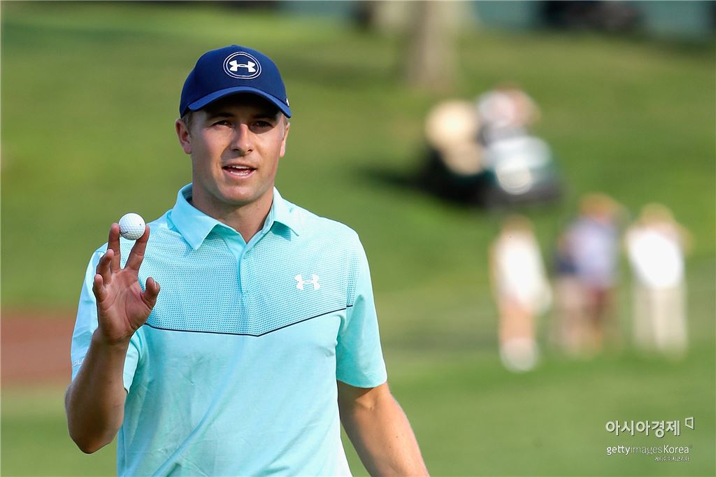 조던 스피스가 'PO 1차전' 더노던트러스트 셋째날 18번홀을 마친 뒤 갤러리의 박수에 손을 들어 답례하고 있다. 올드웨스트버리(美 뉴욕주)=Getty images/멀티비츠