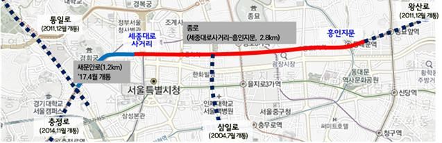 [아시아경제 금보령 기자] 오는 12월이면 종로 일대에서 중앙버스전용차로제가 실시된다. 중앙버스정류소 15개와 횡단보도 7개가 새로 만들어지고, 왕복 8차선 가운데 6차선을 제외한 양 끝 2개 차로는 보행자를 위한 공간으로 조성된다. 서울시는 이와 같은 내용을 담은 '종로 중앙버스전용차로 설치 및 도로 공간 재편 계획'을 28일 발표했다. 우선 종로 2.8㎞ 구간(세종대로사거리~흥인지문)에 오는 12월이면 중앙버스전용차로가 설치된다. 공사는 다음 달 초에 시작한다. 시는 이를 통해 종로 구간의 버스 통행속도가 시속 13.5㎞에서 시속 17.7㎞로 향상될 것으로 기대하고 있다. 해당 구간에는 중앙버스정류소가 15개가 신설된다. 횡단보도는 중앙버스정류소와 연결되는 6개를 포함해 총 8개 새로 생긴다. 버스 노선도 조정된다. 중앙버스전용차로를 설치했을 때 버스들이 꼬리를 물고 늘어서는 현상을 방지하기 위함이다. 시내·광역버스 13개 노선을 조정해 중앙버스정류소를 운행하는 버스를 시간당 160대 이하까지 줄일 계획이다. 471, 710, 405, 701, 9401번 버스는 퇴계로 혹은 율곡로 쪽으로 이미 노선이 조정됐다. 왕복 8개 차로는 6개 차로로 줄어든다. 줄어든 2개 차로는 보행친화 공간 등으로 바뀐다. 보행로 폭은 최대 10.1m까지 늘어난다. 종로 지역 상인들의 불편 해소를 위해 바깥차로 폭은 4m 이상으로 확보한다. 또 창신길 진입로 교차로 및 유턴 신설 등을 추진한다. 2008년 흥인지문 녹지공간조성 당시에 직진로가 없어지면서 약 890m를 우회해야 했던 곳이 창신길 진입로다. 교차로가 신설되면 창신동 봉제공장으로 가는 오토바이들이 바로 진입할 수 있다. 시는 앞으로도 시민의 목소리에 귀 기울이겠다는 입장이다. 그동안 종로 구간 교통체계 변화를 위해 지역자원 및 이해관계자 조사를 위한 용역을 추진했다. 여기에 이해관계자 면담 59회, 주민설명회 5회, 그룹별 주민설명회 6회, 종로발전위원회 2회, 조계종 및 지하상가 별도 면담 24회, 자문회의 및 유관기관 회의 13회 등 총 109회의 협의를 진행했다. 다음 달부터 12월까지 이어지는 공사기간에는 원활한 공사 추진을 위해 교통관리원 및 교통통제수 59명을 배치한다. 각종 교통안내 입간판 등도 466개 설치하고, 주변도로 도로전광표지(VMS) 17개소를 이용해 공사시행 안내와 우회 유도를 할 예정이다. 여장권 시 보행친화기획관은 "종로가 대중교통 및 보행에 친화적인 공간으로 거듭나면 사람이 모이고 상권이 살아나 지역경제에도 큰 활력을 불어넣을 것으로 기대된다"고 말했다. 금보령 기자 gold@asiae.co.kr<ⓒ세계를 보는 창 경제를 보는 눈, 아시아경제(www.asiae.co.kr) 무단전재 배포금지>