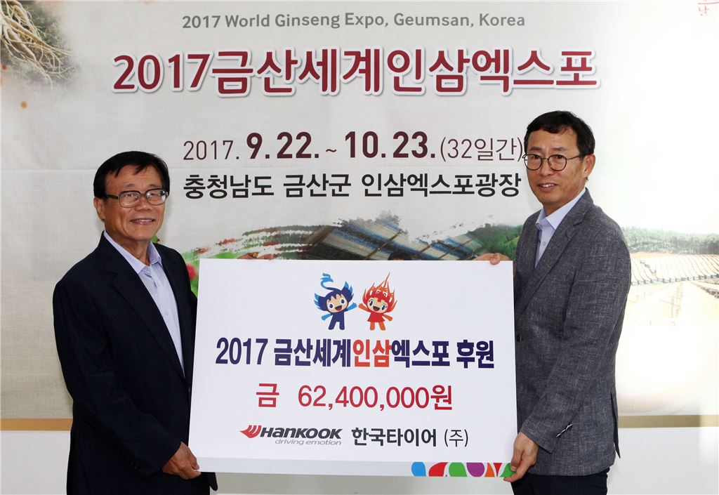 [아시아경제 기하영 기자]한국타이어가 '2017 금산세계인삼엑스포'의 성공적인 개최를 위해 후원금을 전달했다.한국타이어는 지난 25일 금산세계인삼엑스포 조직위원회에서 2017 금산세계인삼엑스포의 성공적인 개최를 위해 후원금 6240만원을 전달했다고 28일 밝혔다. 이 자리에는 이동필 금산세계인삼엑스포 위원장, 신동필 한국타이어 금산공장장과 관계자 등이 참석했다. 한국타이어 임직원들과 동그라미 봉사단은 오는 9월 22일부터 10월 23일까지 진행되는 2017 금산세계인삼엑스포기간 동안 행사장 인근 환경정화와 타이어 무상점검 서비스 등을 지원할 계획이다. 한편 한국타이어는 1997년 이래 21년째 금산세계인삼엑스포 등 금산지역 지역사회축제를 지속적으로 후원하고 있다. 기하영 기자 hykii@asiae.co.kr<ⓒ세계를 보는 창 경제를 보는 눈, 아시아경제(www.asiae.co.kr) 무단전재 배포금지>