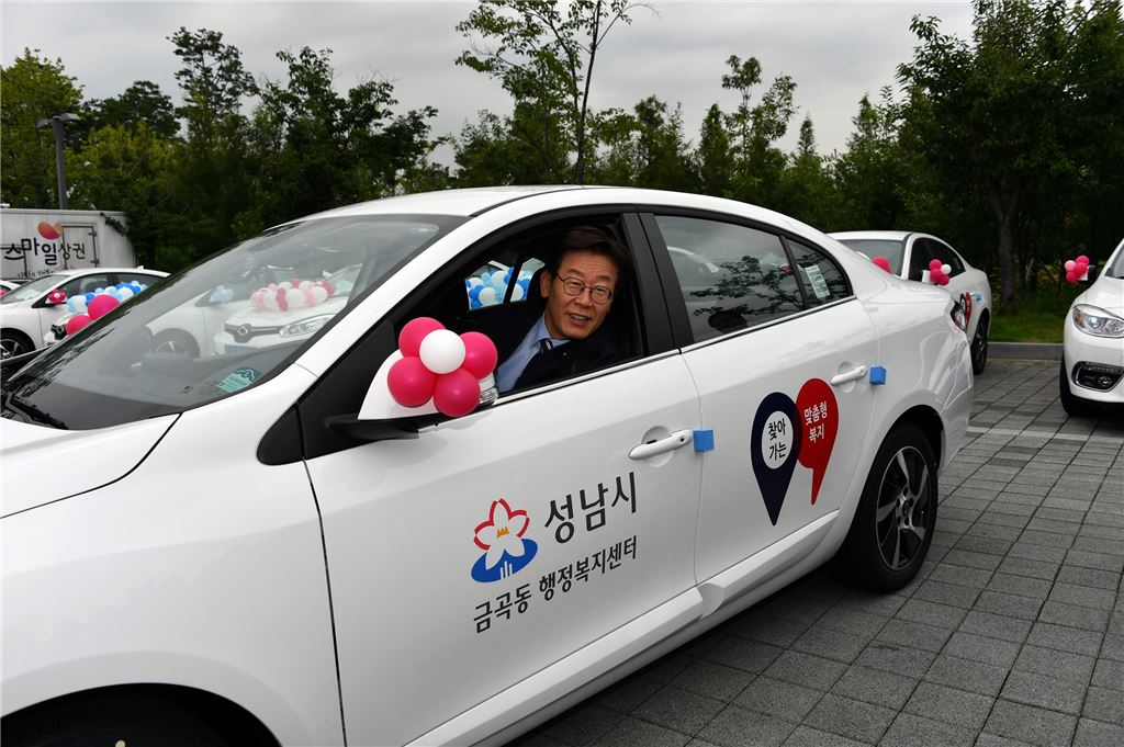 이재명 성남시장이 찾아가는 맞춤형 복지차량에 탑승해 시운전하고 있다.