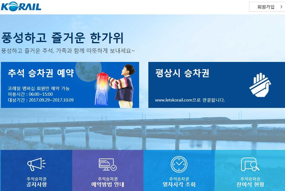 한편 추석 기차표 예매는 오늘 오후 3시까지 진행된다. 30일 오전 6시부터 오후 3시까지는 호남, 전라, 장항, 중앙, 태백, 영동, 경춘선의 예매가 가능하다.예매는 1인당 최대 12매로 1회당 6매 이내로 제한되며 결제는 오는 30일 오후 4시부터 다음달 3일 자정까지 이뤄진다.아시아경제 티잼 김하균 기자 lama@asiae.co.kr<ⓒ세계를 보는 창 경제를 보는 눈, 아시아경제(www.asiae.co.kr) 무단전재 배포금지>