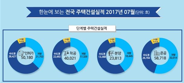 [아시아경제 박민규 기자] 지난달 준공된 주택이 전국적으로 5만9000호에 달한 것으로 조사됐다. 예년에 비해 60% 이상 늘어난 것이다.29일 국토교통부에 따르면 지난 7월 주택 준공(입주) 실적은 전국 5만8718호로 최근 5년 평균보다 62.3% 늘었다. 지난해 7월과 비교해도 47.7% 증가했다. 올 1~7월 누적으로 살펴봐도 30만2634호로 5년 평균보다 31.3% 많았다.수도권보다 지방의 증가세가 더 컸다. 수도권은 7월 준공 물량이 2만6704호로 5년 평균보다 53.8% 늘었다. 같은 기간 지방은 70.1% 증가한 3만2014호를 기록했다. 7월 공동주택 분양(승인) 실적은 전국 2만3813호로 5년 평균보다 1.2% 늘었다. 다만 지난해 7월보다는 33.5% 줄었다.주택 인허가 실적은 전국 5만180호로 5년 평균보다 6.6% 줄었다. 지난해 7월과 비교해도 18.3% 감소했다. 주택 착공도 전국 4만21호로 5년 평균보다 2.3%, 전년 동월보다 25.4% 줄어들었다. 박민규 기자 yushin@asiae.co.kr<ⓒ세계를 보는 창 경제를 보는 눈, 아시아경제(www.asiae.co.kr) 무단전재 배포금지>