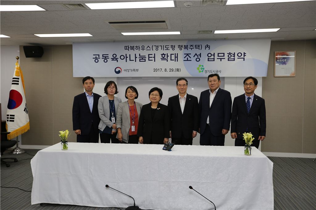 김용학 경기도시공사 사장(오른쪽 세번째)과 정현백 여성가족부장관(중앙)이 공동육아나눔터 확대 조성 협약을 체결한 뒤 기념사진을 찍고 있다.
