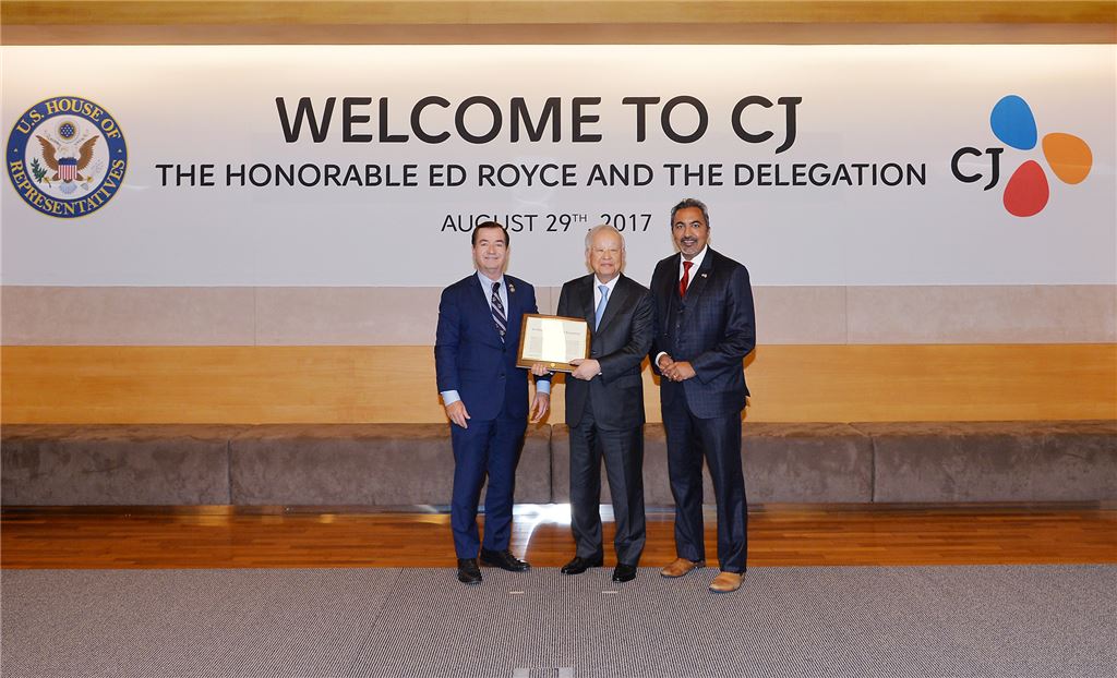 손경식 CJ그룹 회장은 29일 오전 서울 중구 필동 CJ인재원에서 미국 에드 로이스 연방하원의회 외교위원장과 회동을 가졌다. 이날 캘리포니아주 국회의원인 에드 로이스 하원외교위원장은 CJ그룹이 미국에 5억달러 이상의 투자를 통해 연간 매출 6억달러를 창출하고, 1000여명의 고용창출 효과를 거두고 있다며 CJ그룹에 연방의회 감사패를 전달했다. 사진은 왼쪽부터 에드 로이스 美 하원 외교위원장, 손경식 CJ그룹 회장, 아미 베라 하원 외교위 부위원장.<br /> <br /> <br />
