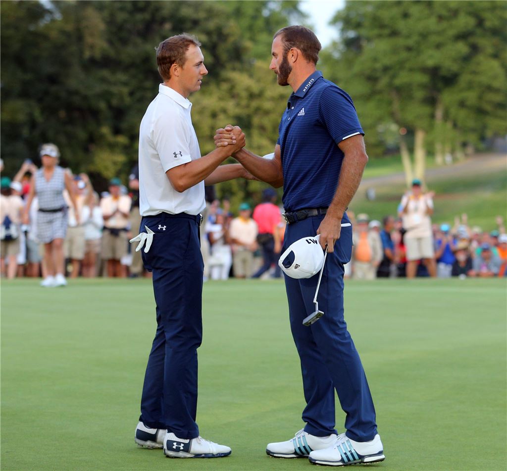세계랭킹 1위 더스틴 존슨(오른쪽)과 2위 조던 스피스의 진검승부가 'PO 2차전' 델테크놀러지스에서 이어진다.
