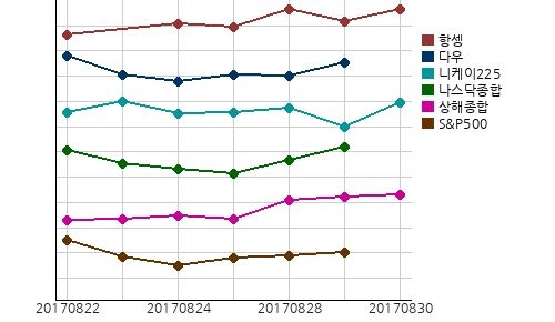 전일 뉴욕증권거래소에서 나스닥종합지수는 전일 대비 18.87포인트(0.3%) 오른 6301.89로 마감됐고, S&P500지수는 전일 대비 2.06포인트(0.08%) 오른 2446.3로 마감됐다. 또한 다우산업지수는 전일 대비 56.97포인트(0.26%) 오른 21865.37로 마감됐다.유럽증시는 이탈리아 FTSE MIB증시가 317.59포인트(1.46%) 하락하여 21408.62를 기록하는 등 독일 DAX30, 영국 FTSE100, 프랑스 CAC40, 러시아 RTS증시가 모두 하향세를 보였다.아시아증시는 현재 항셍, 니케이225, 홍콩H, 대만가권, 항셍차이나대기업 (R), 상해A, 상해종합, 상해B증시가 상승세를 보이는 반면, 인도네시아 IDX종합, 말레이시아 KLCI증시가 하향세를 보이고 있다.국내금시세