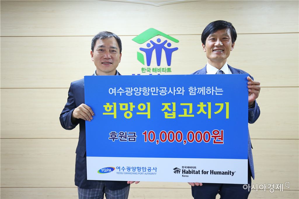 30일 서울 (사)한국해비타트 본부에서 배병춘 여수광양항만공사 경영본부장(오른쪽)이 이종태 해비타트 국내사업본부장에게 ‘희망의 집고치기 후원금’을 전달했다.