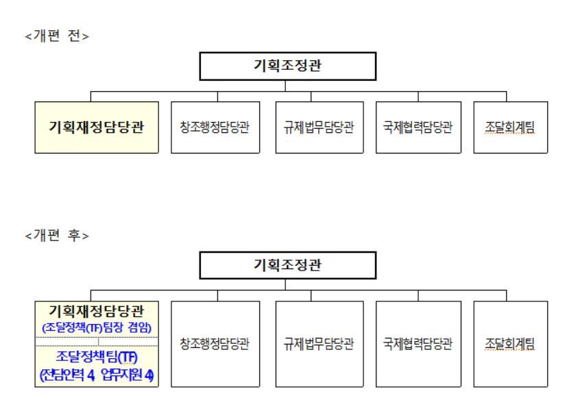 조달청은 내달 1일부터 조달정책팀(T/F)을 신설·운영한다. 조달정책팀은 새 정부의 국정과제 지원과 조직 역할의 재정립에 운영방향이 맞춰진다. 조달청 제공