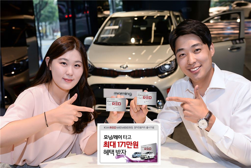 기아자동차 직원들이 1일 기아 레드멤버스 경차전용카드를 소개하고 있다.