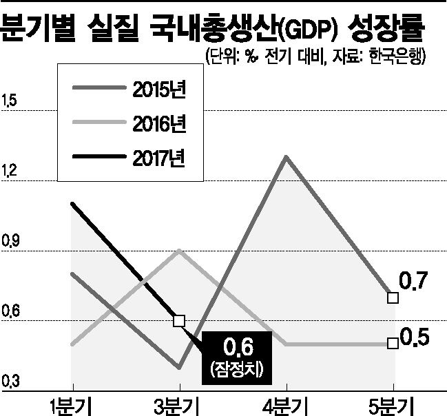[아시아경제 이창환 기자] 올해 2분기 우라나라의 경제성장률이 0.6%로 집계됐다. 이는 지난 7월 발표한 속보치와 같은 수치다. 민간소비와 설비투자가 개선되면서 시장 예상치에 부합하는 성장률을 기록했다. 다만 수출과 건설투자가 부진하면서 1분기에 기록했던 깜짝 성장은 이어가지 못했다. 이같은 분위기가 지속되면 정부가 기대했던 올해 경제성장률 3%는 쉽지 않을 것이라는 전망이 나온다. 한국은행이 1일 발표한 실질 국내총생산(GDP) 잠정치를 보면 2분기 실질 GDP는 약 387조원으로 전기대비 0.6% 증가했다. 1분기 기록했던 1.1%와 비교하면 거의 절반 수준으로 떨어졌다. 그러나 1분기에 깜짝 성장한 데 따른 기저효과와 민간소비 및 설비투자가 개선된 점을 생각하면 나쁘지 않은 성적표라는 것이 한은 측의 설명이다. 6분기 만에 최고치를 기록한 민간소비가 성장을 주도했다. 2분기 민간소비는 1분기보다 1% 늘었다. 소비심리가 개선되면서 가전제품과 휴대전화를 비롯한 내구재 소비가 호조를 보였다. 새 정부 출범 기대감에 힘입은 소비자심리 개선 효과도 반영된 것으로 해석된다.한국은행