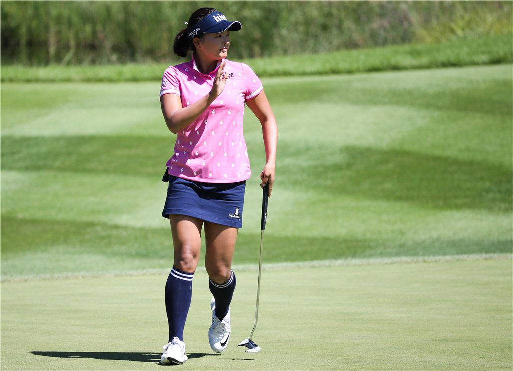 고진영이 한화클래식 둘째날 15번홀에서 버디를 잡아낸 뒤 갤러리의 박수에 손을 들어 답례하고 있다. 사진=KLPGA