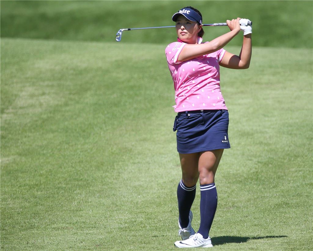 고진영이 한화클래식 둘째날 16번홀에서 아이언 샷을 하고 있다. 사진=KLPGA