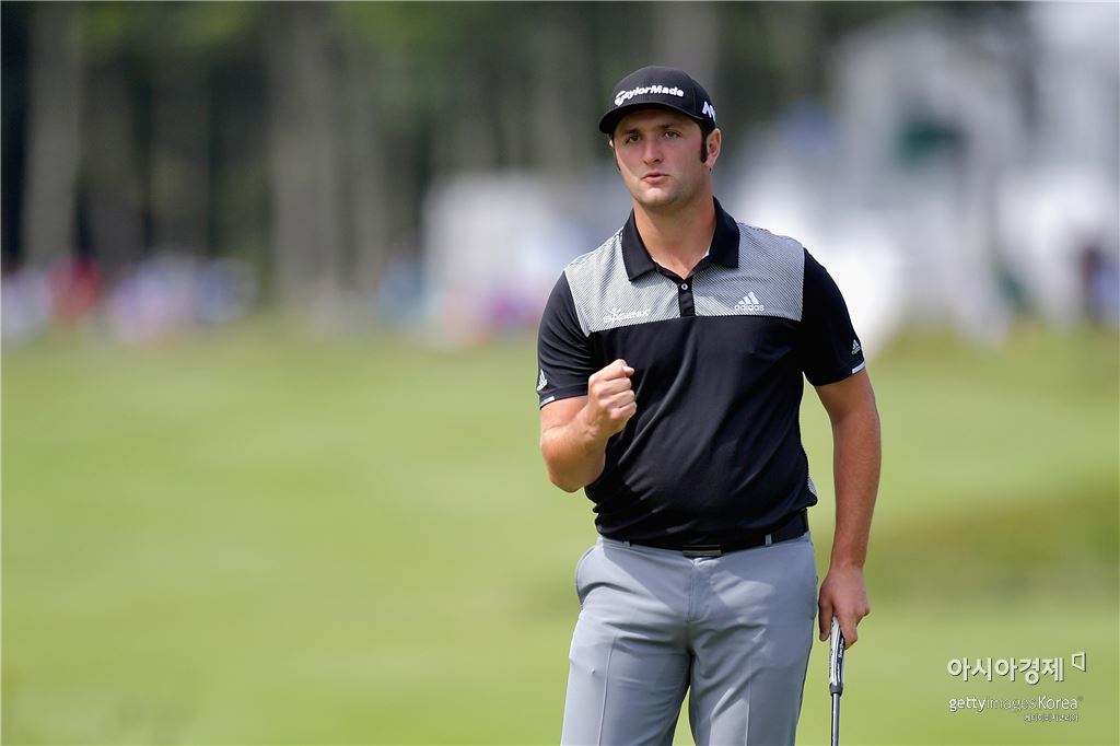 존 람이 'PO 2차전' 델테크놀러지스챔피언십 둘째날 18번홀에서 이글을 잡아낸 뒤 환호하고 있다. 노턴(美 매사추세츠주)=Getty images/멀티비츠
