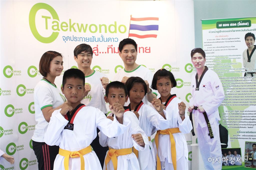 CJ오쇼핑의 태국 합작법인 ‘GCJ’의 성낙제 법인장(뒷줄 두번째)과 태국 태권도 국가대표팀 최영석 감독(뒷줄 세번째)이 태권도 교육을 지원하고 있는 치앙마이 산간학교 학생들과 함께 포즈를 취하고 있다.<br />