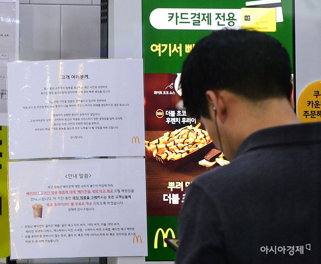 [아시아경제 문호남 기자] 3일 서울 시내 한 맥도날드 매장에 설치된 무인 계산대에 사과문이 부착돼 있다. 지난달 25일 전북 전주 한 맥도날드 매장에서 초등학생 7명과 교사가 불고기 버거를 먹은 뒤 집단 장염에 걸린 사실이 알려지면서 맥도날드는 지난 2일부터 전국 모든 매장에서 불고기 버거 판매를 잠정 중단하고 있다.문호남 기자 munonam@asiae.co.kr<ⓒ세계를 보는 창 경제를 보는 눈, 아시아경제(www.asiae.co.kr) 무단전재 배포금지>