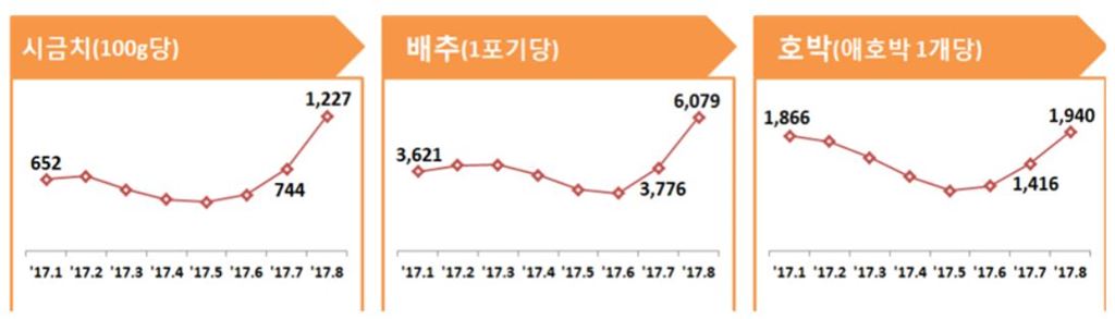 지닌 해 같은 달(2016년 8월)와 비교하면 호박(69.0%)·오이(36.8%)·오징어(33.8%)·감자(33.3%)·돼지고기(32.9%)·무(26.6%)가 상승했다. 샴푸(-20.8%)·린스(-19.3%)·베이비로션(-15.6%)·바디워시(-15.0%)·물휴지(-14.6%)·핸드로션(-14.3%) 등이 하락한 것으로 나타났다. 나주석 기자 gonggam@asiae.co.kr<ⓒ세계를 보는 창 경제를 보는 눈, 아시아경제(www.asiae.co.kr) 무단전재 배포금지>