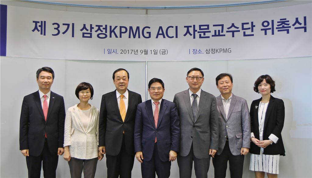 ‘제3기 감사위원회 지원센터(ACI) 자문교수단’ 위촉식에서 (좌측부터)신경철 삼정KPMG 부대표, 지현미 계명대 교수, 김일섭 한국 FPSB 회장, 신경섭 삼정KPMG 감사부문 대표, 손성규 연세대 교수, 김성용 성균관대 교수, 김유경 삼정KPMG 상무(ACI 리더)가 기념촬영을 하고 있다. (제공 삼정KPMG)<br />