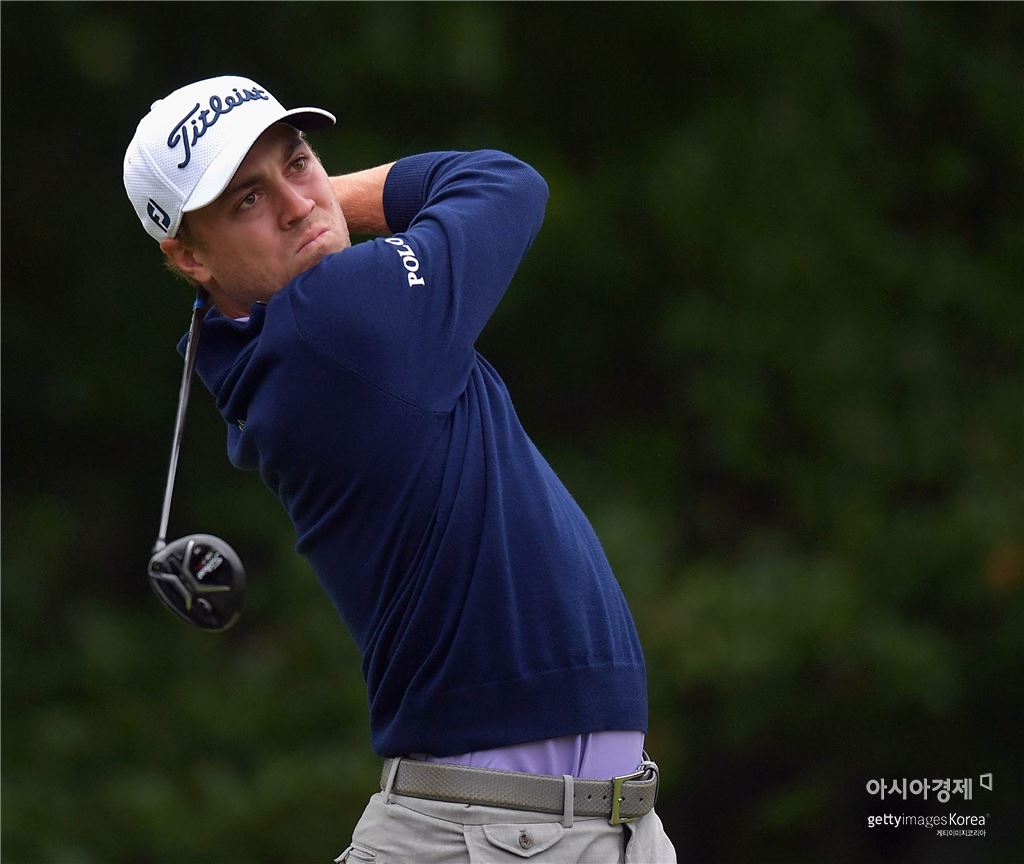 저스틴 토머스가 'PO 2차전' 델테크놀러지스챔피언십 셋째날 4번홀에서 티 샷을 하고 있다. 노턴(美 매사추세츠주)=Getty images/멀티비츠 <br />
