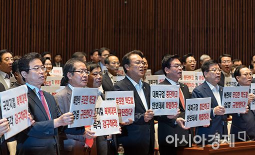 [아시아경제 윤동주 기자] 홍준표 자유한국당 대표와 정우택 원내대표 등 의원들이 4일 국회에서 열린 의원총회에서 '북핵실험 규탄' 구호를 외치고 있다. 자유한국당은 "정부가 방송장악 시도를 하고 있다"고 주장하며 정기국회 일정을 보이콧 하기로 결정했다.윤동주 기자 doso7@asiae.co.kr<ⓒ세계를 보는 창 경제를 보는 눈, 아시아경제(www.asiae.co.kr) 무단전재 배포금지>
