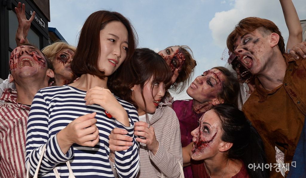 [아시아경제 문호남 기자] 에버랜드가 4일 서울 마포구 홍대거리에서 '좀비'를 소재로 한 도심 속 '공포체험' 이벤트를 하고 있다. 이번 행사는 7일부터 용인 에버랜드에서 열리는 공포체험 시설 '블러드시티'를 알리기 위해 마련됐다. 문호남 기자 munonam@asiae.co.kr<ⓒ세계를 보는 창 경제를 보는 눈, 아시아경제(www.asiae.co.kr) 무단전재 배포금지>