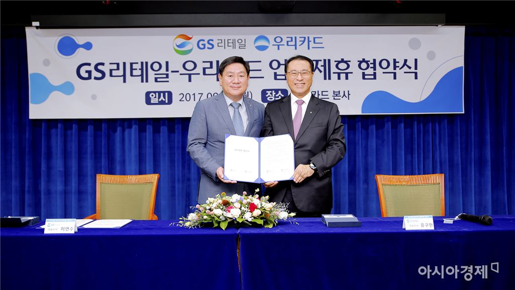 허연수 GS리테일 대표이사(좌)와 유구현 우리카드 대표이사가 업무협약식 후 기념 사진활영을 하고 있다.