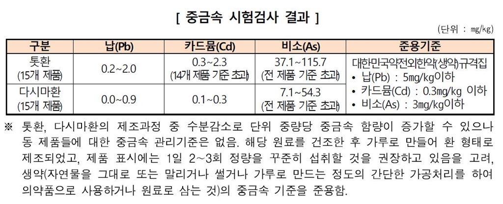 톳환의 경우 비소가 35.1~115.7㎎/㎏이 검출됐다. 이는 대한민국약전외한약(생약)규격집의 규정 3㎎/㎏ 이하를 크게 초과하는 수준이다. 그뿐만 아니라 카드뮴 역시 14개 제품이 기준을 넘어선 것으로 조사됐다. 카드뮴의 경우 0.3~2.3㎎/㎏이 검출되어 0.3㎎/㎏이라는 기준을 넘어섰다. 다시마환의 경우에는 비소가 7.1~54.3㎎/㎏를 초과해 전 제품이 기준(3㎎/㎏이하)을 넘어섰다. 조사대상 제품들은 성인 기준 1일 2~3회 10~50알 정도를 섭취하도록 제품에 표시되고 있고, 어린이의 경우 성인의 절반 용량을 섭취하도록 권장하고 있다. 특히 주요 섭취 대상군에 취약계층인 노인층이 다수를 차지할 것으로 추정됨에 따라 안전기준 마련이 시급한 상황이다. 소비자원 관계자는 "30개 제품을 두고 시험했지만 다른 제품도 유사할 것으로 추정하고 있다"고 말했다.소비자원은 사용한 기준은 한약에 적용되는 기준을 준용해 기준 여부 위반을 판단했다. 중금속이 다량 함유되어 있음에도 불구하고 이들 제품에 대해 관리가 이뤄지지 않은 것은 이들 제품 모두가 중금속 기준이 없는 '기타가공품' 또는 '수산물가공품' 등으로 유통되고 있기 때문이다. 소비자원 관계자는 "현재는 관련 기준이 없는 상태"라면서 "식품의약품 안전처에 기준을 마련해 줄 것을 협의한 상태"라고 소개했다.소비자원은 소비자안전 확보를 위해 관련 업체에 톳환과 다시마환 제품의 자발적 판매중지를 권고하였고 식품의약품안전처에는 건강환 등 '기타가공품'의 중금속 관리기준 신설을 요청키로 했다. 소비자원이 다량의 중금속이 검출됐음에도 톳환과 다시마환 업체에 자발적 판매중지를 권고한 것은 자체적인 행정처분 권한이 없는 탓도 있지만 '정해진 기준'이 없다는 점도 크게 작용했다.다만 소비자원은 톳환과 다시마환의 제조과정 중 수분감소로 단위 중량당 중금속 함량이 증가할 수 있다고 언급했다. 과거 식품의약품안전평가원의 연구사업 등에 따르면 김, 미역, 다시마 등 해조류의 경우 독성이 상대적으로 낮은 유기비소가, 톳·모자반에서는 무기비소가 검출됐는데 건조 등의 과정을 거칠 경우 단위 중량 당 중금속이 늘 수 있다는 것이다. 소비자원 관계자는 "톳환이나 다시마환 제조 과정에서 문제가 있었다기 보다는 환경 오염 등의 영향으로 원료 자체가 오렴됐는데, 제조과정에서 수분함량이 날아가 농도가 높아졌다고 본다"고 설명했다. 나주석 기자 gonggam@asiae.co.kr<ⓒ세계를 보는 창 경제를 보는 눈, 아시아경제(www.asiae.co.kr) 무단전재 배포금지>