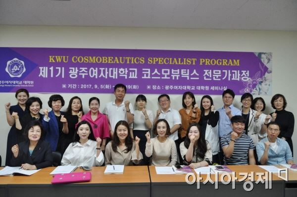 제1기 광주여자대학교 코스모부틱스 전문가 과정 입학식에 참여한 학생들이 화이팅을 외치고 있다. 사진=광주여자대학교