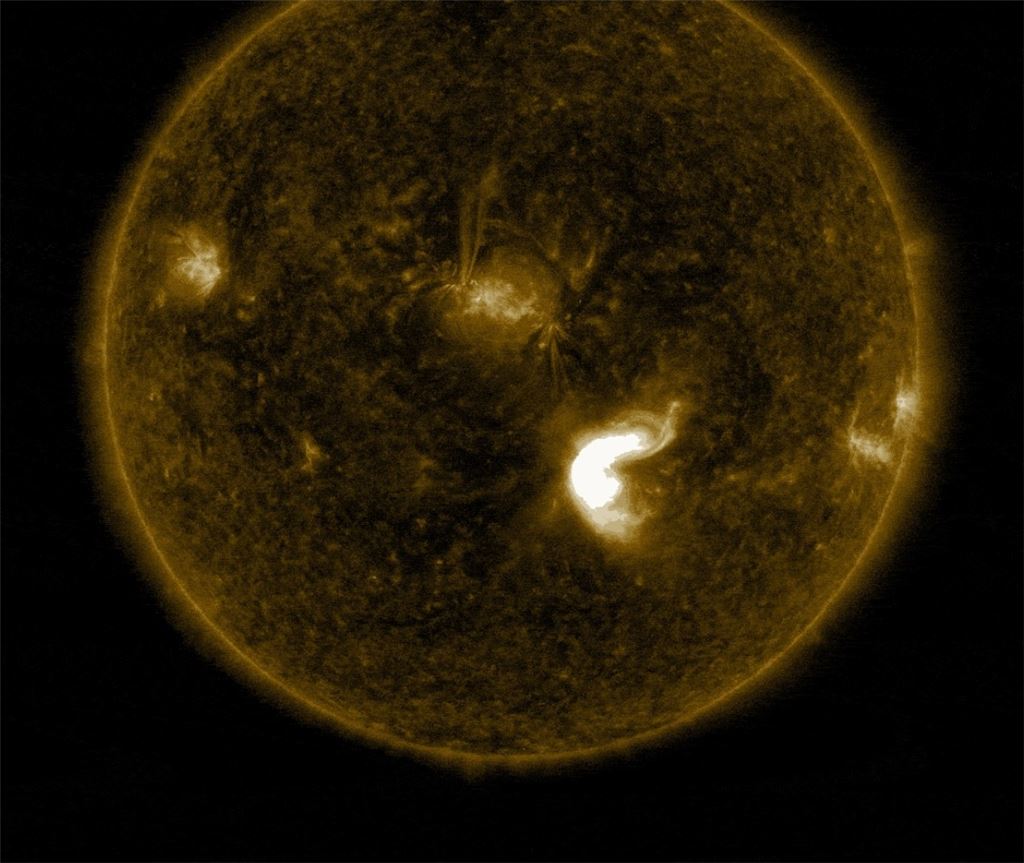 [아시아경제 정종오 기자] 플레어 뿜어내는태양의 거친섬광지구에 다다르고<hr/>태양이 최근 중간단계의 플레어를 분출했다. 미국 항공우주국(NASA)의 태양활동관측위성(SDO)이 지난 4일(현지 시각) 오후 4시33분 태양에서 중단 단계의 플레어가 뿜어져 나오는 모습을 촬영했다. 태양 플레어는 강력한 방사선을 포함하고 있다. 이 같은 방사선은 다행히 지구 대기권을 통과하지는 못한다. 다만 그 양이 많으면 대기권을 교란해 GPS와 통신 시스템에 영향을 미친다. 미국 국립해양대기청(NOAA)은 태양 플레어가 지구에 어떤 영향을 끼치는지를 분석해 우주기후예보센터(//spaceweather.gov)에 공개하고 있다. 플레어의 등급 수준에 따라 관심, 주의, 경고 등의 예보를 한다. 이번에 분출된 플레어는 M5.5 수준으로 확인됐다. M 등급은 가장 강력한 X등급의 10분의1 크기에 해당된다. M2는 M1보다 두 배정도 강력하다는 것을 의미한다.▲5일 NOAA가 파악한 태양흑점. NOAA는 우주기후예보를 제공한다.[사진제공=NOAA]