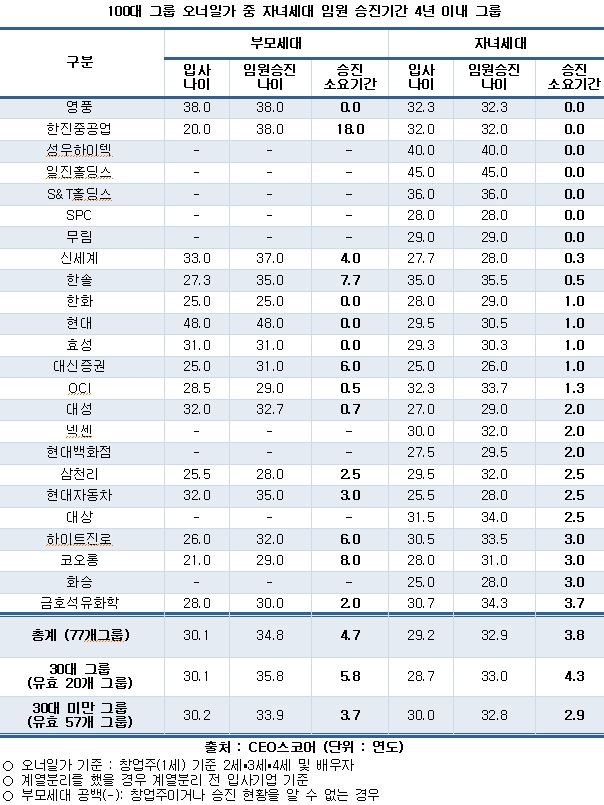 [아시아경제 박미주 기자]국내 100대 그룹 오너일가는 입사 후 4.2년 만에 임원으로 초고속 승진하는 것으로 나타났다. 평균 29.7세에 입사해서 33.9세에 별을 다는 셈이다.6일 기업 경영성과 평가사이트 CEO스코어에 따르면 총수가 있는 100대 그룹 중 오너일가가 임원으로 근무 중인 77개 그룹 185명의 승진 현황을 조사한 결과 입사 후 임원에 오르는 데 평균 4.2년이 걸린 것으로 나타났다. 평균 29.7세에 입사해 33.9세에 임원을 달았다.일반 직원의 경우 임원 승진 평균 나이가 51.4세(2016년 9월 말 기준)인 점을 감안하면 오너일가가 일반 직원에 비해 무려 17.5년이나 빠른 셈이다.임원 승진 기간은 부모세대보다 자녀세대로 올수록 짧아지고 있다. 재계 1~2세대가 주로 해당되는 부모세대(공정거래위원회 동일인 기준)는 평균 30.1세에 입사해 4.7년 후 임원으로 승진했지만, 3~4세대로 분류되는 자녀세대는 29.2세에 입사해 3.8년 만에 임원을 달았다.입사 후 사장이 되는 시점도 부모세대보다 자녀세대가 짧았다. 부모세대는 입사 후 평균 13.5년 후인 43.3세에 사장단에 오른 반면 자녀세대는 불과 12.5년 만인 40.4세에 사장단으로 승진했다.이런 경향은 그룹 규모가 작을수록 더 두드러졌다. 30대 그룹 오너일가의 임원 승진기간은 5.0년이었던 반면 하위 70대(31~100위) 그룹은 3.4년으로 1.6년 짧았다. 입사 후 사장으로 승진하는 데 걸리는 기간도 상위 30대 그룹은 14.6년인데 비해 하위 70대 그룹은 11.9년으로 2.8년이 빨랐다.자사 또는 타사 경력이 없음에도 입사와 동시에 임원을 단 사람은 22명이었다. 이는 전체 조사대상 185명의 11.9%에 해당한다.30대 그룹 오너일가 중 김승연 한화그룹 회장, 신영자 롯데복지재단 이사장, 이명희 신세계 회장, 정유경 신세계(백화점 부문) 총괄사장, 최창영 고려아연 명예회장 등 9명(40.9%)이 경력 없이 임원을 단 경우다. 하위 70대 그룹 중에는 정몽진 KCC 회장, 이순형 세아그룹 회장, 김영대 대성산업 회장, 채동석 애경산업 부회장, 이호진 태광그룹 전 회장, 조원국 한진중공업 전무, 허진수 SPC 부사장, 임종훈 한미약품 전무 등 13명(59.1%)이 이에 해당됐다.입사 후 1년 내에 임원 승진한 경우는 정교선 현대백화점 부회장(0.8년), 조현상 효성 사장(0.9년), 김동관 한화큐셀 전무(0.9년), 안용찬 애경 부회장(0.8년), 임세령 대상 전무(0.8년), 한경록 한솔제지 상무(0.9년) 등 6명(3.2%)이다.이들과 반대로 입사 후 임원 승진까지 10년 이상 걸린 이들은 23명(12.4%)이었다. 조남호 한진중공업 회장은 입사 후 18.3년 만에 임원으로 승진해 가장 오래 걸렸고, 구자엽 LS전선 회장(16.6년), 구자용 LS네트웍스 회장(16.0년), 허명수 GS건설 부회장(15.2년), 박석원 두산엔진 부사장(14.0년), 김남구 한국투자금융 부회장(11.2년), 구본능 희성 회장(11.2년), 김남정 동원 부회장(11.0년), 임주현 한미약품 전무(10.1년), 장선익 동국제강 이사(10.1년)도 10년 넘어서 임원을 달았다.사장단에 오르는 기간은 그룹마다 차이가 있었다. 신창재 교보생명 회장, 홍석조 BGF리테일 회장, 현정은 현대그룹 회장 등 3명은 회사 입사와 동시에 사장단에 올랐다. 김승연 한화 회장(0.3년), 한창훈 리앤한 대표(0.6년), 김하철 일진반도체 대표(0.7년), 박용현 두산연강재단 이사장(0.9년) 역시 입사 후 1년이 안 돼 사장단에 올랐다.반대로 신영자 롯데복지재단 이사장은 입사와 동시에 임원을 달았지만 사장까지는 35.6년이 걸렸다. 구자엽 LS전선 회장(27.8년), 허연수 GS리테일 사장(26.1년), 구자열 LS 회장(25.1년), 함영준 오뚜기 회장(23.3년), 이휘령 세아제강 사장(23.2년), 장세주 전 동국제강 회장(21.3년), 박태원 두산건설 부회장(20.5년) 등 26명(17.6%)도 입사 후 사장까지 20년 넘게 걸렸다.박미주 기자 beyond@asiae.co.kr<ⓒ세계를 보는 창 경제를 보는 눈, 아시아경제(www.asiae.co.kr) 무단전재 배포금지>