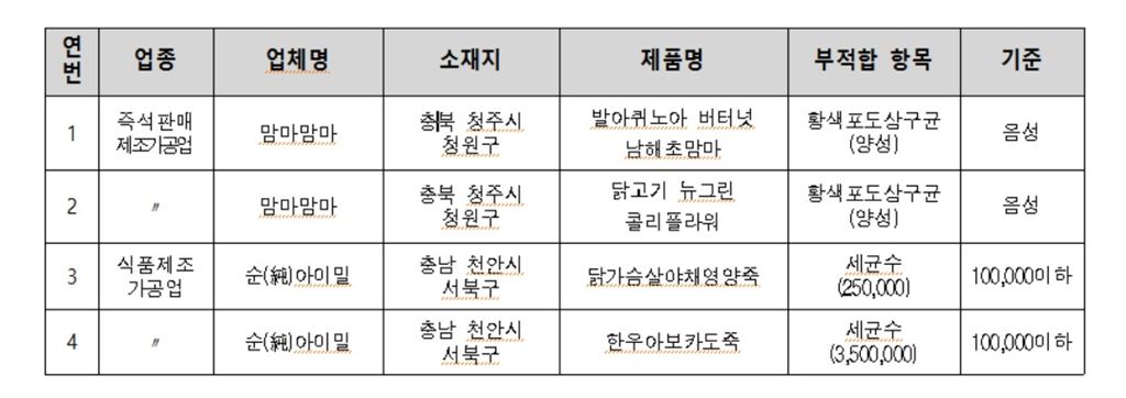 [아시아경제 서소정 기자]온라인 등을 통해 유통되는 이유식 4종에서 식중독균이 검출됐다. 식품의약품안전처는 이달 9일까지 온라인과 대형마트 등에서 유통되는 이유식·간식 등을 제조하는 업체 81곳을 점검한 결과, 11곳을 적발하고 행정조치 등을 했다고 6일 밝혔다.주요 위반 내용은 ▲허위표시·과대광고(3곳) ▲표시기준 위반(2곳) ▲자가품질검사 미실시(3곳) ▲무신고 소분업(1곳) ▲위생적 취급기준 위반(1곳) ▲관계서류 미작성 등(1곳) 등이다.식약처 조사에 따르면 식품제조업체 아가맘(경기도 남양주시 소재)은 인터넷을 통해 판매할 목적으로 무표시 제품(기타영·유아식 43품목)을 냉장창고에 보관하다 적발됐다.집단급식소 식품판매업체 프레시아트주식회사(경기도 고양시 소재)는 식품소분업 영업신고를 하지 않고 필리핀과 브라질에서 수입된 유기농 갈색설탕을 소분·판매하다 적발됐다. 또 온라인과 대형마트 등에서 유통되는 이유식 등 32개 제품을 수거·검사한 결과 4개 제품(표 참조)에서 식중독균 등이 검출돼 폐기 등 조치했다.식약처는 "앞으로 영·유아 등 취약계층 먹거리에 대한 안전관리를 강화해 불량식품이 제조·유통·판매되지 않도록 지속적으로 점검할 계획"이라고 말했다. 서소정 기자 ssj@asiae.co.kr<ⓒ세계를 보는 창 경제를 보는 눈, 아시아경제(www.asiae.co.kr) 무단전재 배포금지>
