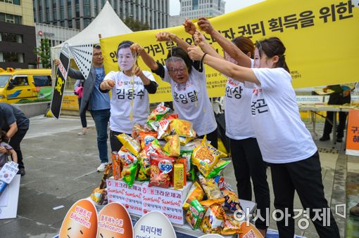 [아시아경제 강진형 기자]6일 오후 서울 종로구 광화문 광장에서 열린 '안전한 먹거리 문화와 소비자 권리 획득 위한 시민단체 연대 기자회견'에서 동물권단체 관계자들이 계란을 이용한 가공식품 회사를 향해 계란이 첨가되지 않은 과자 판매를 요구하고 있다.강진형 기자 aymsdream@asiae.co.kr<ⓒ세계를 보는 창 경제를 보는 눈, 아시아경제(www.asiae.co.kr) 무단전재 배포금지>