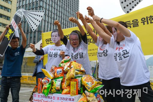 [아시아경제 강진형 기자]6일 오후 서울 종로구 광화문 광장에서 열린 '안전한 먹거리 문화와 소비자 권리 획득 위한 시민단체 연대 기자회견'에서 동물권단체 관계자들이 계란을 이용한 가공식품 회사를 향해 계란이 첨가되지 않은 과자 판매를 요구하고 있다.강진형 기자 aymsdream@asiae.co.kr<ⓒ세계를 보는 창 경제를 보는 눈, 아시아경제(www.asiae.co.kr) 무단전재 배포금지>