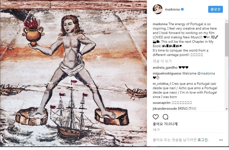 마돈나는 지난 4일(현지시간) "포르투갈의 활력은 매우 대단하다"며 "창조성이 풍부해지는 듯한 기분이 든다. 앨범 작업과 영화작업이 기대된다"고 기록했다.(출처=마돈나 인스타그램)