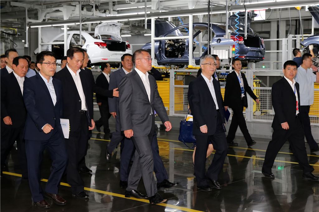 지난 7월 충칭공장 생산기념식에 참석한 장궈칭 충칭시 시장(중앙 오른쪽)을 비롯 충칭시 관계자들이 정의선 현대차 부회장(중앙 왼쪽)과 함께 시험생산하고 있는 충칭공장 생산라인을 둘러보고 있다.