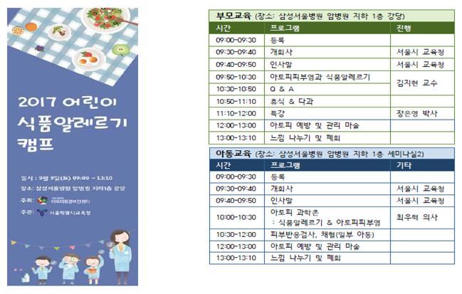 [아시아경제 이민우 기자] 서울시교육청은 오는 9일 오전 9시부터 13시까지 서울 강남구 일원동 서울삼성병원에서 '2017년 제2차 부모 동행 식품알레르기 캠프'를 실시한다고 8일 밝혔다.식품알레르기로 인해 어려움을 겪고 있는 초등학교 1학년 학생과 학부모 200명이 대상이다. 가정과 학교에서 식품알레르기에 따른 응급 상황이 발생할 경우 대처법을 교육한다.또한 학생들에게 혈액 검사와 알레르기 피부반응검사를 무료로 실시하고 학교급식 식단에서 알레르기 유발식품을 피하고 안전한 대체식을 알려주는 영양교육을 제공한다. 학부모들에게는 소아청소년과 전문의 교육과 1:1 상담을 진행한다.조희연 서울시교육감은 "식품알레르기가 있는 학생들에게 학교급식에서도 소외감을 느끼지 않는 공정한 급식 기회를 제공하고, 캠프를 통하여 자아 존중감을 높여 주는 계기가 되길 바란다"고 말했다.이민우 기자 letzwin@asiae.co.kr<ⓒ세계를 보는 창 경제를 보는 눈, 아시아경제(www.asiae.co.kr) 무단전재 배포금지>
