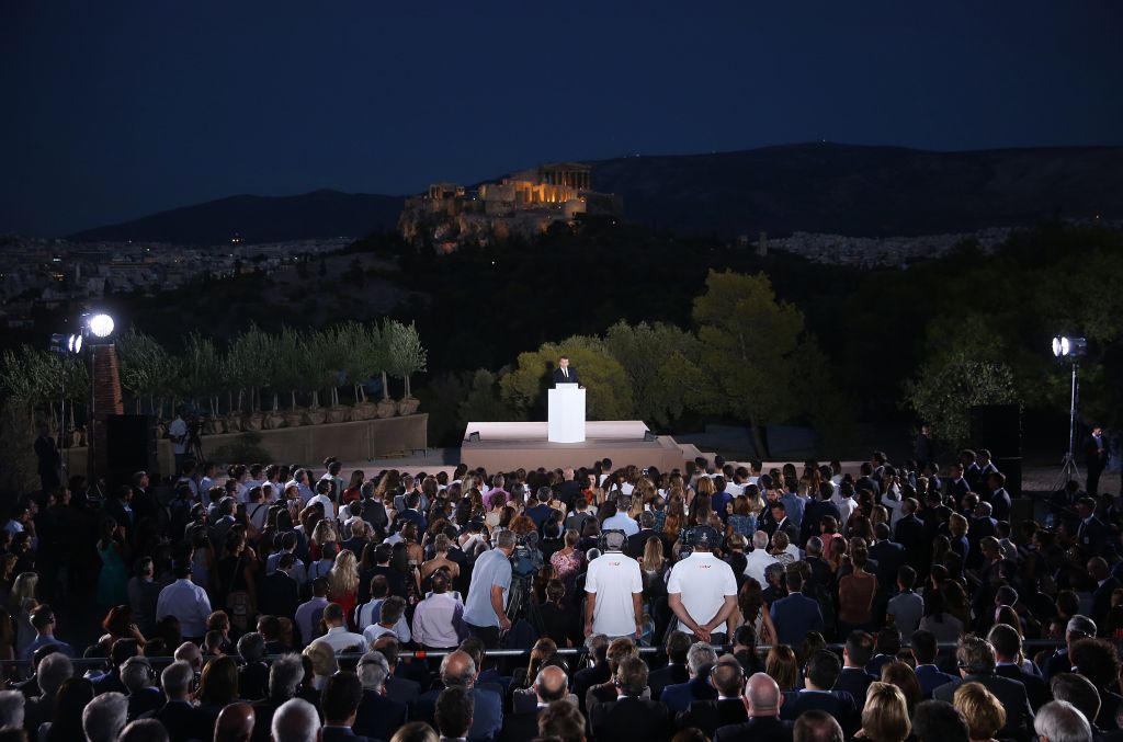 [이미지출처=EPA연합뉴스]에마뉘엘 마크롱 프랑스 대통령이 7일(현지시간) 그리스 아테네의 프닉스 언덕에서 연설하고 있다.