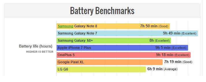 1등은 단종된 갤럭시노트7이 차지했다. 갤럭시노트7은 전원이 꺼질 때까지 총 9시간49분이 걸렸다. 원플러스5가 9시간 18분으로 뒤를 이었으며, 아이폰7플러스는 9시간5분을 버텼다. 갤럭시노트8은 7시간 50분을 기록해 갤럭시S8플러스(8시간)보다도 이용시간이 짧았다. 구글 픽셀XL은 7시간 19분을 버텼으며 LG G6는 6시간9분으로 테스트 제품 중 꼴찌를 기록했다.갤럭시노트8은 갤럭시노트7(3500mAh)에 배터리 용량을 200mAh 줄여 출시됐다. 갤럭시노트7에서 배터리 발화 문제 때문에 보수적으로 제품을 내놓은 것으로 해석된다. 갤럭시S8플러스는 3500mAh의 배터리를 탑재했다.하지만 아이폰7플러스는 2900mAh의 배터리를 탑재하고도 갤럭시노트8에 비해 1시간 이상 사용시간이 길어 주목된다. 아이폰은 운영체제와 제품사이의 최적화와 두뇌 역할을 하는 애플리케이션 프로세스(AP) 성능 개선을 통해 효율적인 전력 소모를 자랑하고 있다. 오는 12일(현지시간) 미국에서 공개되는 아이폰8에서는 메인보드 공간이 크게 줄면서 더 큰 배터리가 탑재되고, LCD보다 에너지 효율적인 OLED 패널이 들어가 사용 시간이 더욱 늘어날 것으로 예상된다.배터리 충전시간(사진=폰아레나)