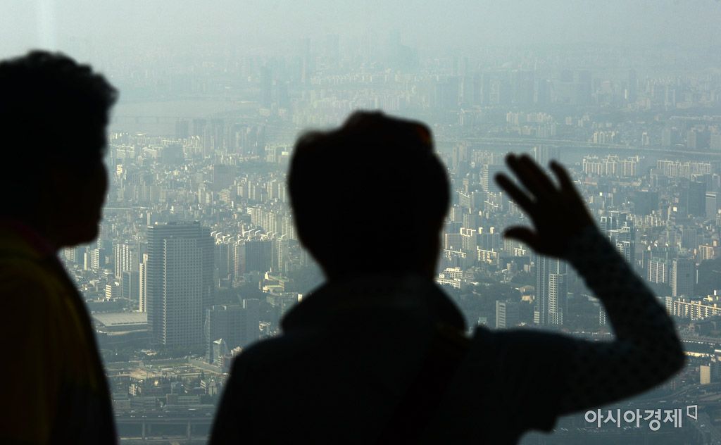 [아시아경제 문호남 기자] 미세먼지 농도가 한때 '나쁨' 수준을 보인 8일 서울 송파구 롯데월드타워에서 시민들이 흐린 도심을 바라보고 있다.문호남 기자 munonam@asiae.co.kr<ⓒ세계를 보는 창 경제를 보는 눈, 아시아경제(www.asiae.co.kr) 무단전재 배포금지>