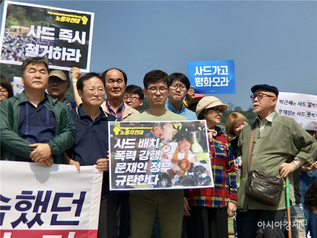 '사드한국배치저지전국행동'은 8일 오후 1시께 청와대 분수대 광장에서 문재인정부의 사드(THAAD·고고도미사일방어체계) 배치를 규탄하는 기자회견을 열었다. [사진=정준영 기자]