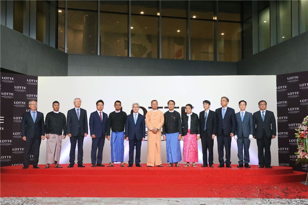 왼쪽부터) 3번째 포스코건설 한찬건 사장, 4번째 김정환 롯데호텔 대표이사, 6번째 송용덕 호텔&서비스BU장, 7번째 우 오 마웅 미얀마 호텔관광부 장관, 8번째 우 표 민 떼인 양곤 주지사, 11번째 포스코대우 김영상 사장을 비롯한 내외빈들이 기념 촬영을 하고 있다. 사진제공=롯데호텔