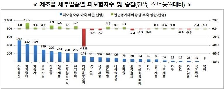 [아시아경제 이광호 기자]구조조정의 여파로 조선업의 고용보험 가입자 수가 5개월 연속 20%대의 감소세를 이어갔다. 11일 고용노동부가 발표한 '8월 노동시장 동향'에 따르면 선박과 철도, 항공기 등을 만드는 '기타 운송장비 제조업'의 취업자 수는 14만5000명으로 지난해 같은 기간과 비교해 22.4%(4만1800명) 감소한 것으로 나타났다. 역대 최고 감소율을 나타낸 지난 6월(24.3%)을 기점으로 감소폭이 다소 완화됐으나, 4월(22.1%) 이후 5개월 연속 20%대다. 기타운송장비 부문의 고용보험 가입자 수는 17개월 연속 마이너스를 나타내고 있다.피보험자 규모가 가장 큰 제조업은(356만4000명)은 조선업 취업자 감소로 지난해 같은 기간보다 가입자 수가 6000명 감소했다. 기타 운송장비 부문을 제외할 경우 제조업 피보험자 가입자 수는 1.2%(4만1000명) 늘었다.이 가운데 피보험자 규모(51만9000명)가 가장 큰 반도체 등 전자통신 제조업은 지난 6월 42개월 만에 증가로 전환된 후 3개월 째 증가세를 유지하고 있다. 기계장비 제조업 피보험자는1만3500명이 늘어나 전체 제조업 중에서 가장 큰 증가 폭을 보였고, 보건의료 수요에 맞춰 의료정밀(4500명), 의약품(3400명)도 취업자 수가 늘었다. 반면 섬유와 의복은 각각 2200명, 2400명 줄었다. 이에 따라 지난달 전체 피보험자 수는 지난해 같은 달보다 2.4%(29만6000명) 증가한 1285만명으로 집계됐다. 한편 노동이동 정보를 보여주는 피보험 자격 취득자는 지난달 52만8000명으로 3.6%(1만9000명) 증가했다. 상실자(실직자)는 51만1000명으로 7.5%(3만6000명) 늘었다. 이 중 경력 취득자는 45만명으로 전체 취득자(52만8000명)의 85.3%로 취득이 확대되고 있다. 비자발적 실업 상태로의 이동 추이를 보여주는 구직급여 신규 신청자 수는 지난달 7만1000명으로 지난해 같은 기간보다 1,5%(1000명) 늘었다. 세종=이광호 기자 kwang@asiae.co.kr<ⓒ세계를 보는 창 경제를 보는 눈, 아시아경제(www.asiae.co.kr) 무단전재 배포금지>
