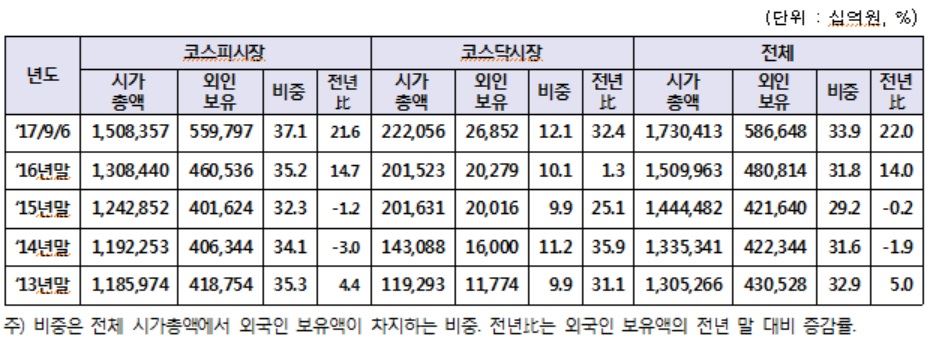 코스피시장에서는 대형주, 코스닥시장에서는 중견기업의 보유비중이 가장 크게 늘었다. 코스피시장에서 대형주가 83조원으로 지난해 말 대비 20.9% 늘었다. 소형주는 5000억원(12.8%), 중형주는 1조6000억원(6.6%) 증가했다. 코스닥은 중견(2조3000억원, 76.2%)→ 벤처(8000억원, 46.6%)→ 우량(3조3000억원, 23.1%)→ 기술성장(610억, 21.9%) 순으로 증가했다. 코스피 내 외국인 지분율이 가장 큰 업종은 전기전자(51.18%)였으며 다음은 통신업(44.8%), 운수장비업(37.5%) 순이었다. 지난해 말 이후 보유 시총 증가율이 가장 큰 업종은 금융업(64.02%)이었다. 외국인 보유 시총이 가장 작은 업종은 종이목재(5.02%)였으며 보유 시총이 가장 크게 감소한 업종은 서비스업(-21.43%)이었다. 코스피에서 외국인 지분율이 가장 높은 종목은 동양생명(84.6%)이며 다음은 한국유리(80.7%), S-Oil(78.5%), 쌍용차(77.5%), 하나금융지주(73.8%) 순이었다. 코스닥에서는 한국기업평가(84.3%)의 지분율이 가장 높았다. 다음은 한국정보통신(62.2%), 에스텍(55.9%), 서화정보통신(53.9%) 순이었다..