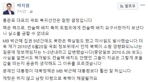 박지원 국민의당 전 대표가 홍준표 자유한국당 대표의 한반도 전술핵 배치 주장을 비판했다.10일 오후 박지원 전 대표는 페이스북을 통해 “홍준표 대표의 국회 복귀선언은 잘한 결정입니다”라며 “(그러나)핵은 핵으로, 전술핵 배치 특히 트럼프에게 전술핵 배치 요구서한까지 보낸다니 실소를 금할 수 없다”고 밝혔다.이어 “MB·박근혜 집권 9년간에도 북한은 핵실험도 했고 미사일도 발사했습니다”라며 “더욱 제가 2010년 6월25일 국회 정보위에서 언제 북핵이 소형 경량화되느냐는 질문에 정보책임자는 1~2년 내라고 답변했습니다. 사실을 알면서도 핵 개발도 전술핵 배치도 안 했던 그들이 지금은 그렇게 호들갑을 떠는지 곰곰이 생각해도 그 이유를 모르겠다”고 비판했다.또 “문재인 대통령이 대북정책은 MB·박근혜 대통령보다 훨씬 잘 하십니다”라며 “제 탓은 하지 않고 남 탓 타령으로 북핵이 해결될까요”라고 지적했다.한편, 9일 홍 대표는 “우리한테 가장 불리한 여론조사기관도 전술핵 찬성 60%가 나왔다. 여론이 달라졌다”며 북한의 6차 핵실험으로 한반도 전술핵 배치와 핵 개발을 위해 1000만 명 국민 서명운동을 시작하겠다고 밝혔다.홍준표 자유한국당 대표가 9일 오후 서울 강남구 코엑스몰 앞에서 열린 '5천만 핵 인질·공영방송장악' 국민보고대회에 참석해 발언하고 있다. /사진=연합뉴스<br />