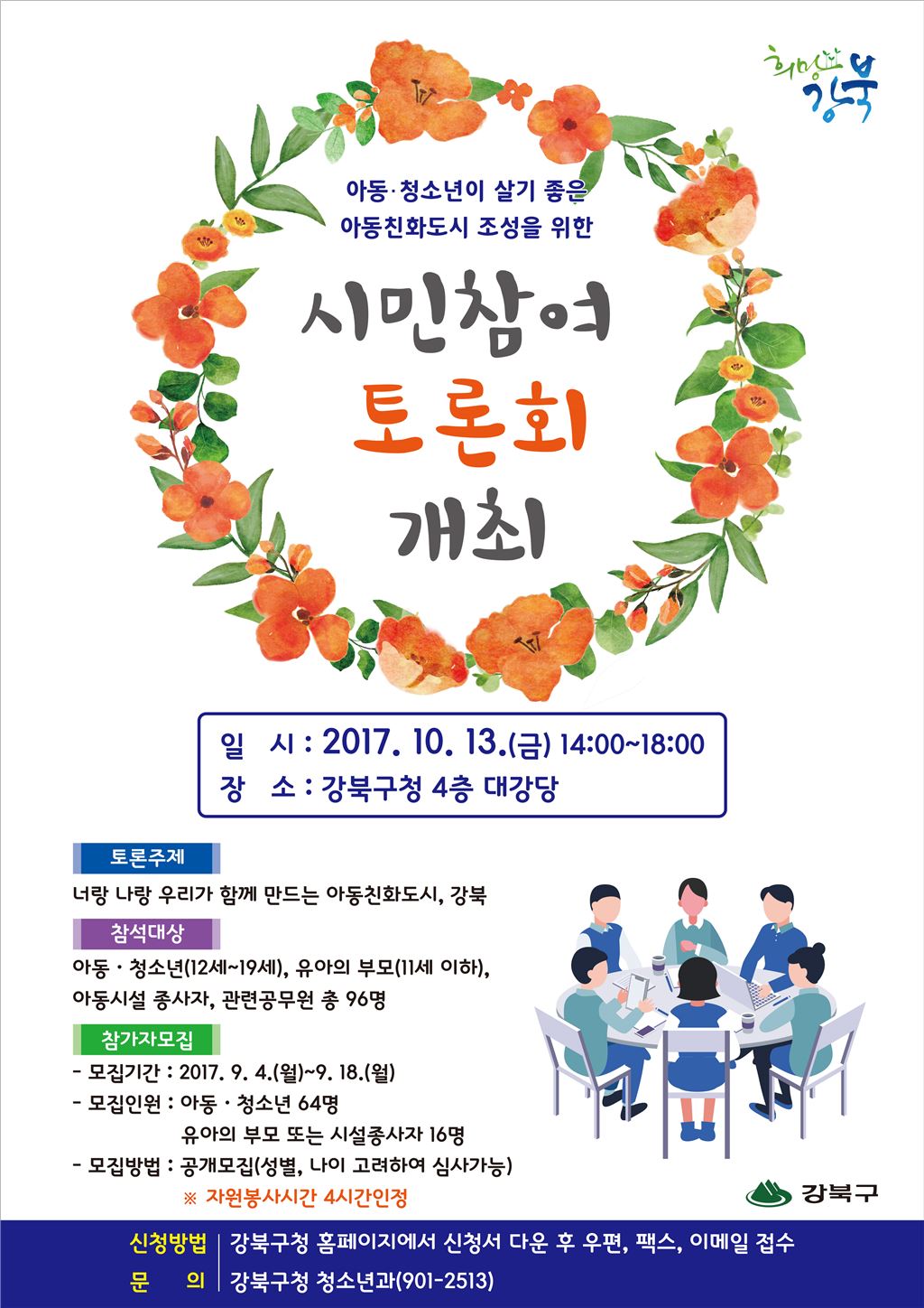 이날 토론회에서 수렴된 의견은 ‘아동·청소년 희망참여단’의 2차 토론을 거쳐 강북구에서 시행 중인 134개의 아동사업과 매칭해 구체화, 이를 통해 아동친화도시 4개년 계획을 수립하고 아동영향평가를 진행할 계획이다.또 토론 후에는 수유역 주변에서 ‘아동권리 존중 및 아동학대 예방 캠페인’도 실시한다. 참가자들은 유엔아동권리협약 및 강북구 아동·청소년 권리선언문을 시민들에게 배포할 예정이다.토론회와 캠페인 참여자에게는 4시간 자원봉사시간을 인정해준다.참가를 원하는 시민은 강북구청 홈페이지(www.gangbuk.go.kr) 팝업창에서 신청서를 내려 받아 이메일(natur3025@gangbuk.go.kr), 팩스(901-5537), 우편(서울시 강북구 도봉로89길 13, 강북구청 청소년과) 또는 방문(강북구청 4층 청소년과) 접수하면 된다. 박겸수 강북구청장은 “아동과 관계자들이 한자리에 모여 아동이 진정으로 희망하는 아동정책에 대한 토론을 하고, 여기서 제안된 사항들을 구정에 반영해 강북구가 아동친화적인 도시가 될 수 있도록 최선을 다하겠다”면서 “시민참여토론회에 많은 참여를 부탁한다”고 말했다. 청소년과(901-2513)박종일 기자 dream@asiae.co.kr<ⓒ세계를 보는 창 경제를 보는 눈, 아시아경제(www.asiae.co.kr) 무단전재 배포금지>